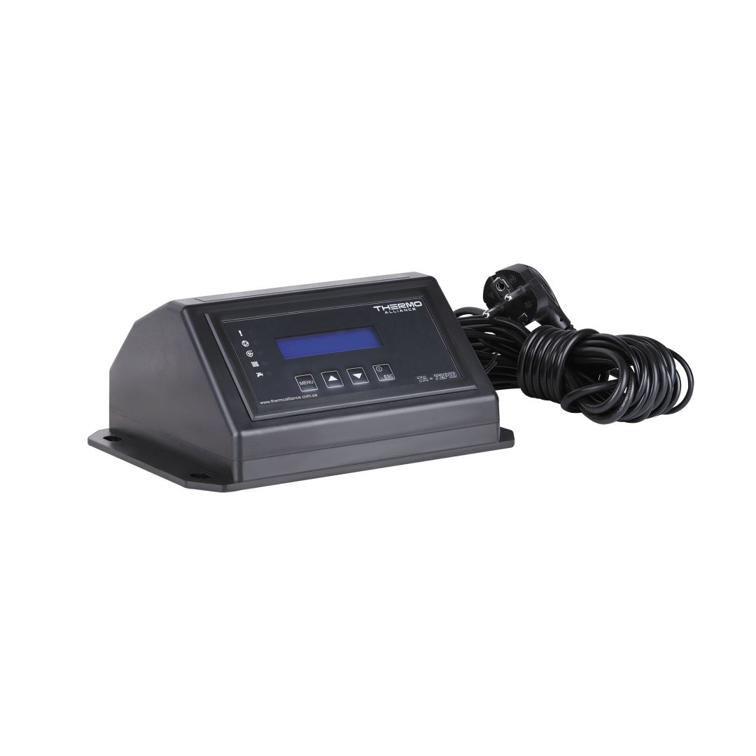 Контролер Thermo Alliance TA72v1PID для управління вентилятором, насосом ЦО, кімнатним термостатом працює за інноваційним алгоритмом PID, який в автоматичному режимі підбирає потужність котла в залежності від навантаження. Автоматика підвищить безпеку всієї інженерної системи, її економічність, спростить обслуговування. Діапазон настройки температури для увімкнення вентилятора — 35–80 °C. Для налаштування параметрів роботи пристрою є зручна панель управління з дисплеєм.