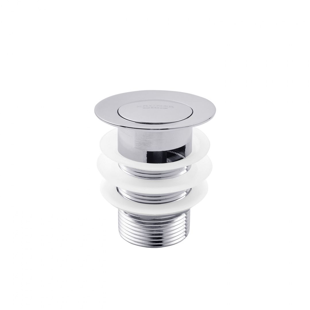 Донний клапан для раковини Kroner KRM - C962-1 1 1/4" з переливом виконаний з латуні в хромованому кольорі, що дає можливість поєднувати його з раковинами з таким же покриттям. Виріб дозволить перекрити зливний отвір у разі необхідності та використовувати раковину як таз, а наявність переливу убереже вас від потопу, якщо ви ненадовго відволіклися під час набирання води.Клапан монтується не більше 5 хвилин і керується натисканням на кришку у вигляді круглої кнопки.