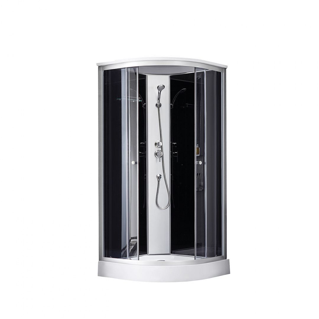 Душовий бокс Kroner KRP Enzo - SD.C.F.G. 90x90 см - це стильне і функціональне рішення для вашої ванної кімнати. Душевой бокс має компактні розміри 90x90 см і форму чверті круга. Ця форма ідеально підходить для ванних кімнат з обмеженим простором. Піддон низький і має висоту всього 145 мм. Виготовлений з високоякісного акрилу, він є міцним і довговічним. Глибина піддону становить 40 мм, забезпечуючи зручність під час прийому душу. Конструкція дверей - розсувна, а матеріал полотна дверей - скло тоноване сірого кольору. Це не тільки надає виробу елегантний вигляд, але і забезпечує вашу конфіденційність під час душу. До комплекту душового боксу входить велика кількість необхідних елементів, таких як сифон, двері, ручки, ролики, профіль, кришка, задні стінки, душова панель, змішувач, лійка для ручного душу, лійка для верхнього душу, душовий шланг, кронштейн для ручного душу, шлангове підключення, ніжки, комплект кріпильних деталей та полиця. Це робить його готовим до установки та використання.