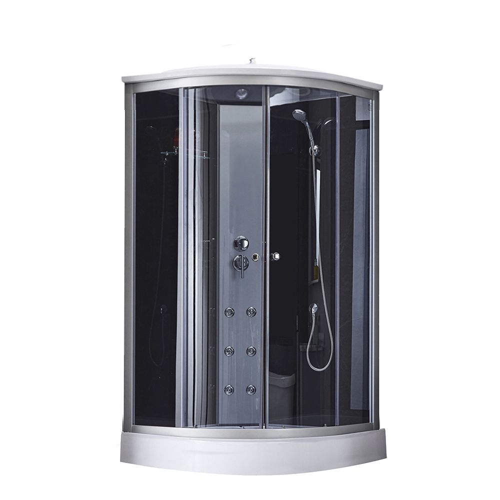 Піддон, сифон, двері, ручки, ролики, профіль, комплект кріплень, задня стінка, панель, змішувач, лійка для ручного душу, лійка для верхнього душу, душовий шланг, кронштейн, ніжки, верхня кришка, скляна полиця.