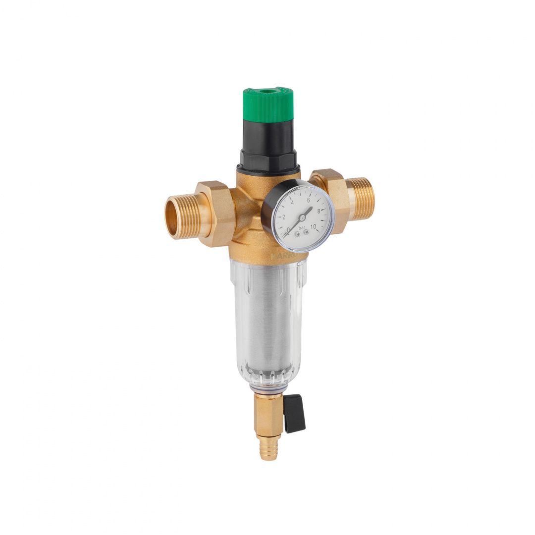 Фільтр самоочисний з редуктором тиску Karro 1" KR-8800 прозорий - це якісний аналог фільтра для холодної води Німецького виробництва Honeywell FK06 за привабливішою ціною. Пристрій обладнаний редуктором і системою прямої промивки, картридж - нержавіюча сітка 100 мкм. надійно очистить воду від механічних забруднень і сміття. Завдяки редуктора, який являє собою голову фільтра, ви самі легко виставити на шкалі необхідне вихідна тиск яке буде підтримуватися приладом, це дасть можливість вам економити витрати води, а так само надійно захистить водопровід і обладнання в магістралі від гідроударів, надлишкового тиску і відповідно від поломок і пошкоджень. Матеріал корпусу фільтра, з'єднувальні гайки і штуцера виготовлені з високоякісної латуні. Колба предфильтра - ударостійкий, стійкий до перепадів температур пластик. Фільтруюча сітка 100 мкм. - нержавіюча сталь. Доступний і ефективний за своїми властивостями фільтр - редуктор тиску.