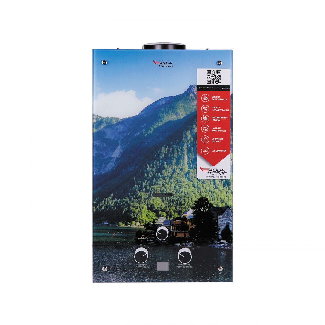 Колонка газовая дымоходная Aquatronic JSD20-AG208 10 л режим Зима/Лето, панель из стекла с рисунком горы