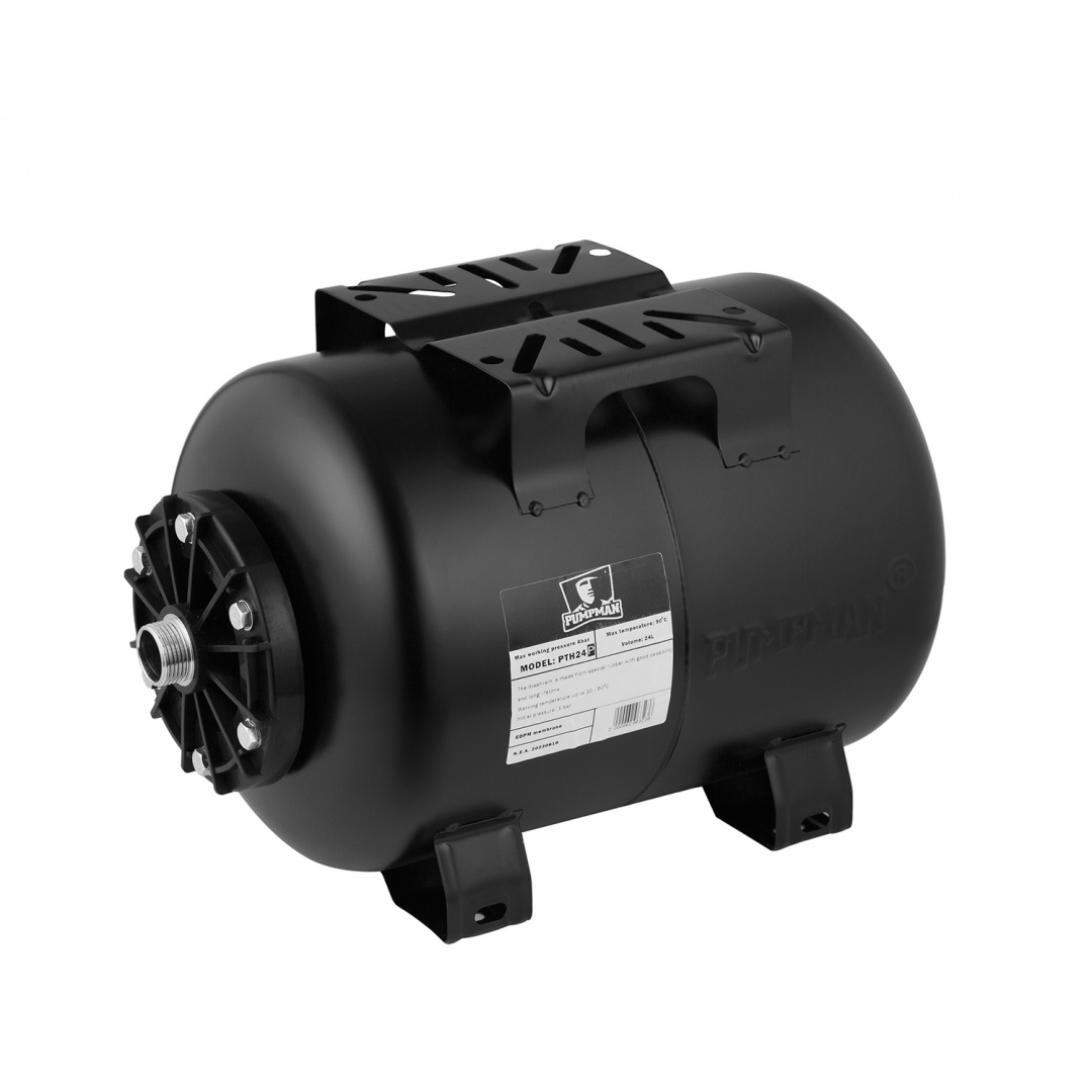 PUMPMAN 24 H — горизонтальний гідроакумулятор об'ємом 24 літри, призначений для стабілізації тиску в системах водопостачання, зменшення кількості включень насоса та захисту від гідроударів. Ідеально підходить для побутових насосних станцій, систем поливу та автономного водопостачання.