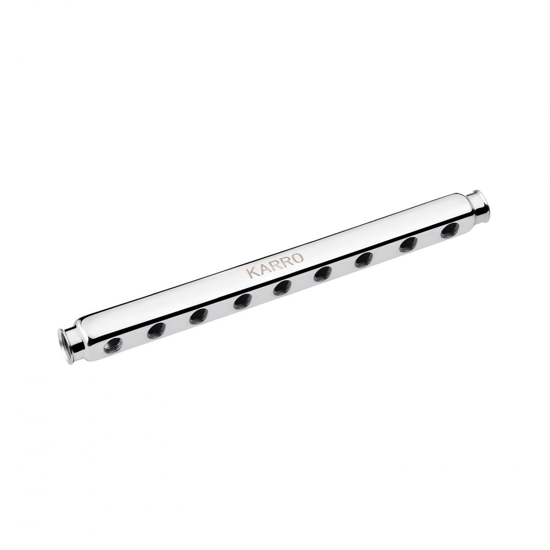 Колектор Karro 1"х1/2" на 9 виходів KR-1003 нержавіюча сталь призначено для використання в трубопроводах холодного та гарячого водопостачання, в системах опалення, стисненого повітря, а також на технологічних трубопроводах, що транспортують рідини, неагресивні до матеріалів колектора. Перевагою використання колекторів Karro є мінімальна кількість з'єднань і те, що немає перепаду тиску між споживачами. Колектори Karro виробляються з високоякісної неіржавкої сталі і тому не бояться корозії.