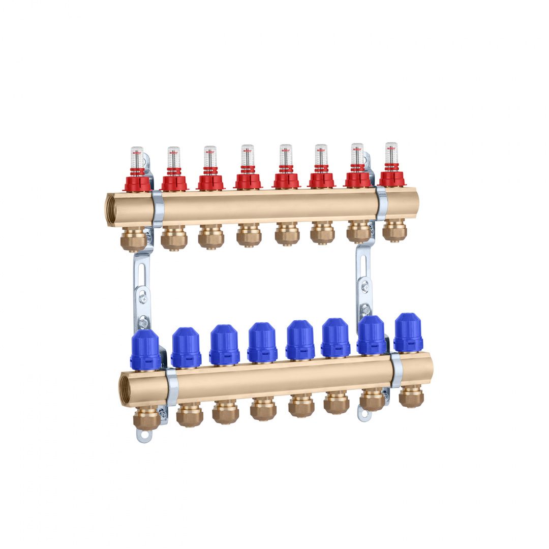 Колектор в зборі STA 1"х3/4" з євроконусами на 8 контурів, латунний - це гідравлічний компонент, який використовується для розподілу теплоносія чи питної води (технічної) в системах опалення чи водопостачання з трьома окремими контурами. Кожен контур на цьому колекторі має євроконуси, що дозволяють підключати та регулювати потік теплоносія в кожному контурі окремо.