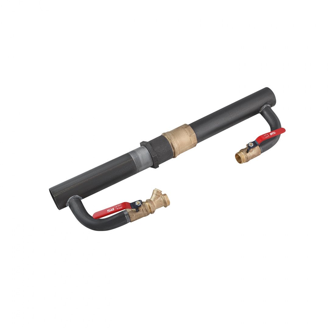 Байпас короткий у зборі STA (DN) 50 з клапаном - це готовий до встановлення вузол, призначений для створення обвідної лінії (байпаса) в трубопровідних системах з умовним проходом (DN) 50 мм. Основна функція байпаса полягає в забезпеченні можливості тимчасового відключення або обслуговування певної ділянки трубопроводу (наприклад, насоса, фільтра, лічильника) без повної зупинки потоку рідини в системі.