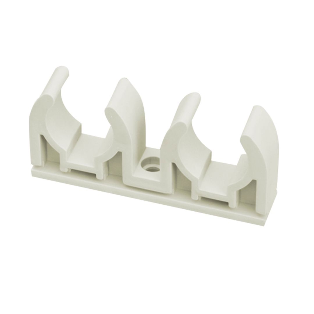 Подвійне кріплення PPR Blue Ocean 20 виготовлено з високоякісного поліпропілену в білому класичному кольорі, завдяки чому термостійкий та виглядає естетично. Саме тому його частіше застосовують під час монтажу водопроводу з гарячою і холодною водою. Кріплення складається з пласкої основи з отворами для шурупів і двох U-подібних скоб для фіксації на стіні труб діаметром 16 мм.