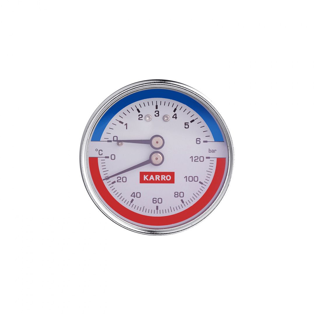 Термоманометр Karro 1/2"х1/4" горизонтальний 63 мм KR-1086В з футоркою і клапаном одночасно вимірює тиск і температуру теплоносія, що спрощує контроль за системою опалення. Кожна зі шкал має свій колір, що усуває плутанину. Так само їх добре видно на відстані. У термоманометра Karro датчик укладено в латунний корпус, що робить його стійким до окислення До того ж такий сплав відмінно проводить тепло, що усуває можливість спотворення показників.
