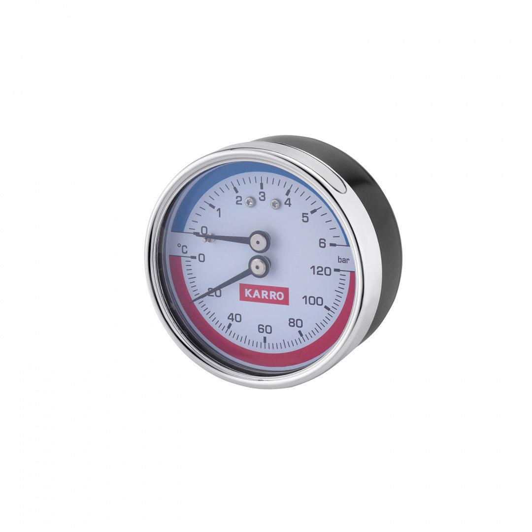 Термоманометр Karro 1/2"х1/4" горизонтальний 80 мм KR-1086 з футоркою і клапаном одночасно вимірює тиск і температуру теплоносія, що спрощує контроль за системою опалення. Кожна зі шкал має свій колір, що усуває плутанину. Так само їх добре видно на відстані. У термоманометра Karro датчик укладено в латунний корпус, що робить його стійким до окислення До того ж такий сплав відмінно проводить тепло, що усуває можливість спотворення показників.