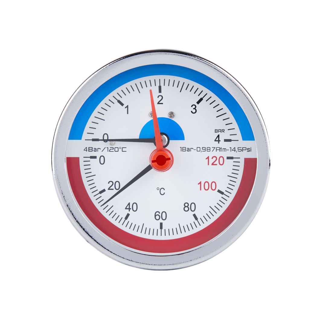 Термоманометр SD Plus 80 мм 1/2", заднє підмикання SD1734B - комбінований прилад для одночасного вимірювання та контролю тиску, і температури. Термоманометр конструктивно об'єднує в собі два прилади: манометр і термометр в одному корпусі, має дві шкали - тиску і температури.