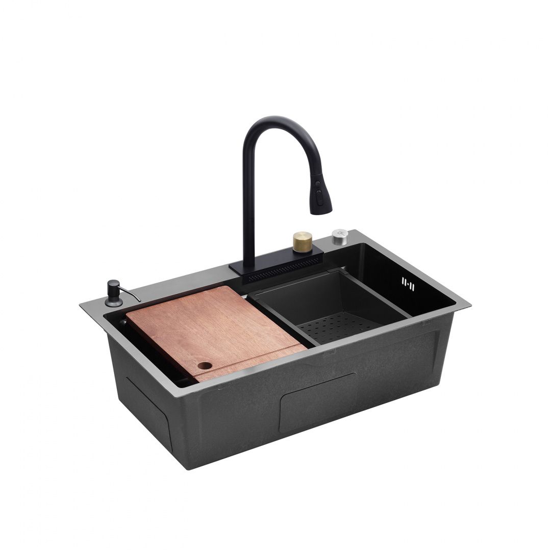 Левая сторона отвечает за управление смесителем, правая — за панель с водопадом. Уникальный режим водопада позволяет удобно мыть фрукты и овощи.