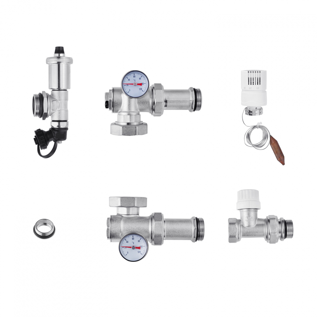 Прямий термостатичний клапан, термоголовка з занурювальним датчиком, згони для циркуляційного насоса з термометром, зливна група.